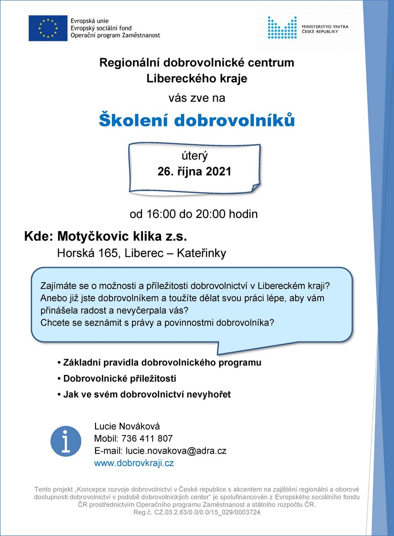 Místo konání: Motyčkovic klika z.s. (Horská 165, Liberec – Kateřinky) , v úterý 26. října 2021 od 16:00 do 20:00 hodin.