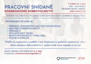 Srdečně vás zveme na pracovní snídani koordinátorů dobrovolnictví, která se uskuteční v úterý 23. září 2025 od 9:00 do 11:00 hodin v kanceláři ADRA Liberec (Železná 253/20).